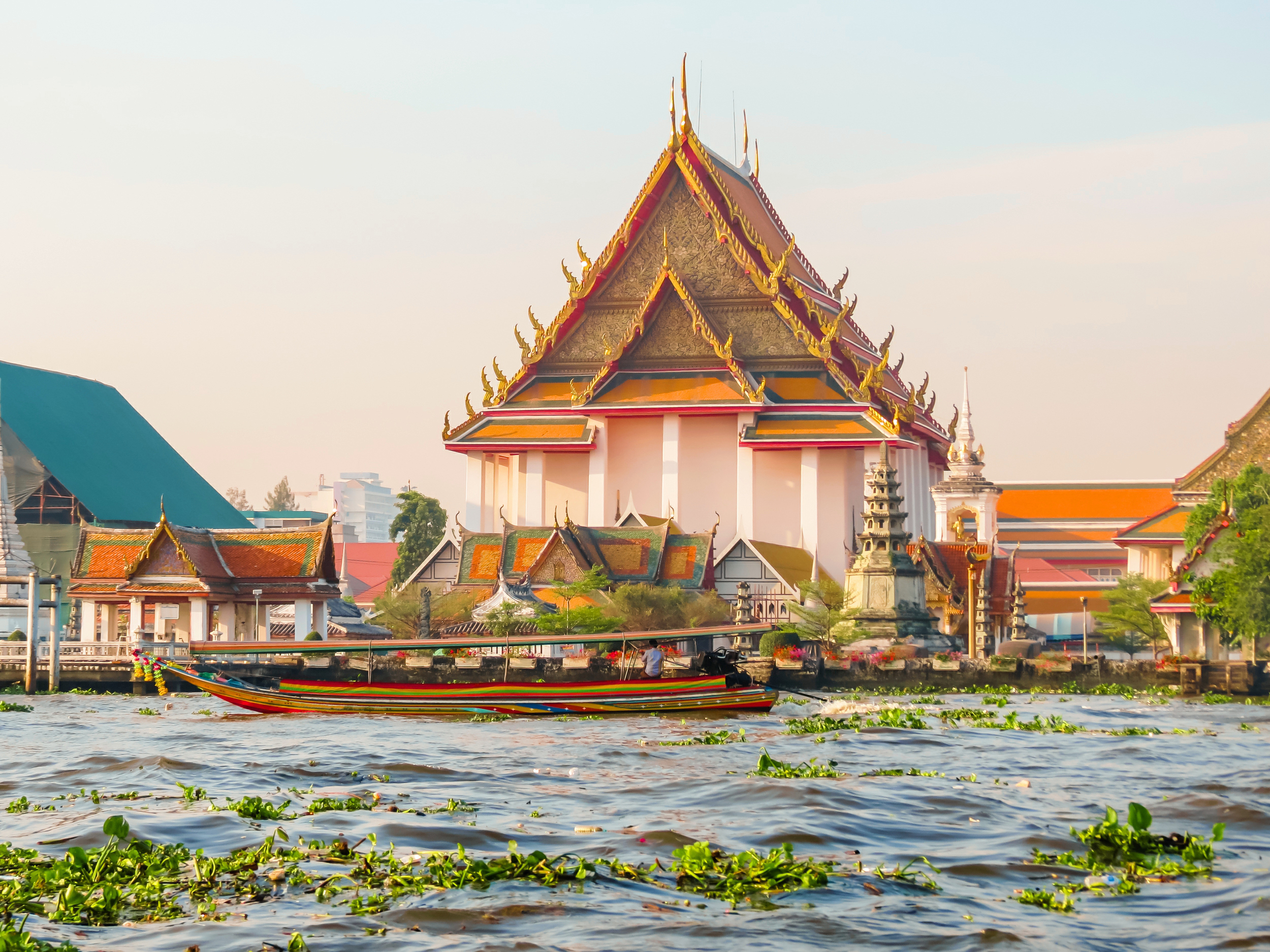 Bei der zentralen Attraktion, dem Königspalast, verlasst ihr das Boot am Maharaj Pier. Der „Große Palast“ war bis zur Mitte des 20. Jahrhunderts die Residenz der Könige Thailands. Auf dem Gelände findet ihr auch den in Gold erstrahlenden, buddhistischen Tempel Wat Phra Kaeo. Um eintreten zu dürfen, müsst ihr angemessen gekleidet sein, ihr könnt euch vor Ort entsprechende Kleidung ausleihen. Weiter südlich am Flussufer liegt der sehenswerte Tempel Wat Pho und auf der gegenüberliegenden Seite des Flusses der Tempel Wat Arun. Wat Arun bietet, wenn ihr seine steilen Treppen erklommen habt, einen fantastischen Blick auf den Chao Phraya und die Stadtkulisse von Bangkok.