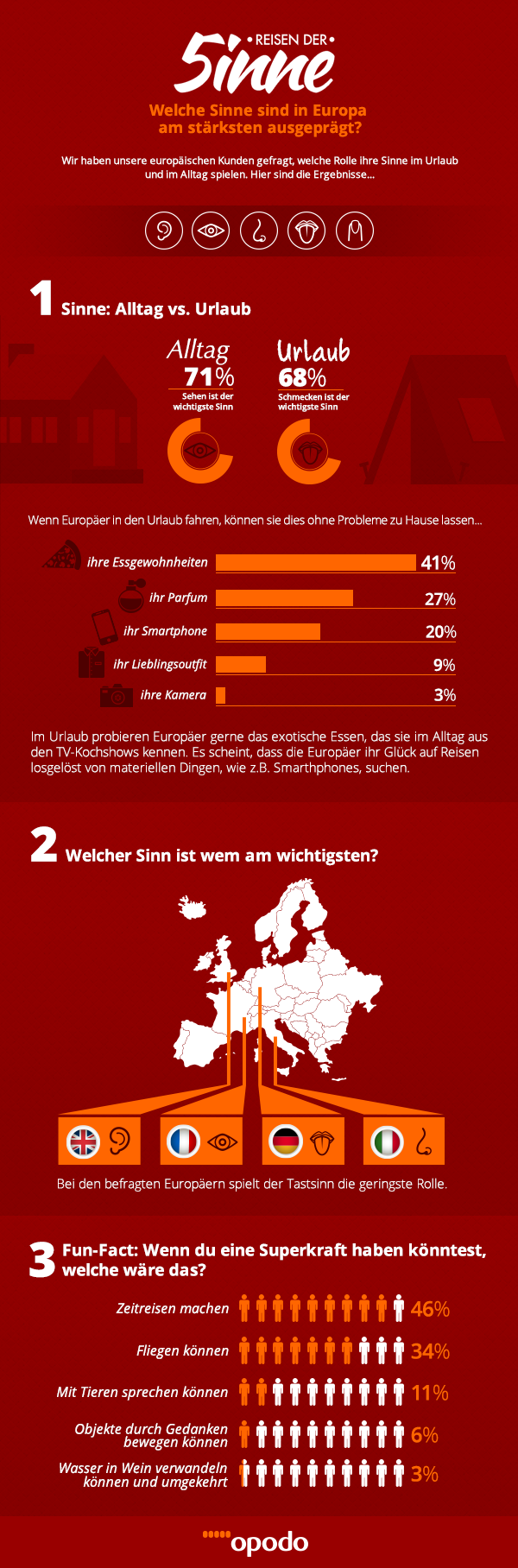 Welche Sinne sind in Europa am stärksten ausgeprägt? Diese Frage haben wir uns gestellt und die Antwort in einem Persönlichkeitstest zum Thema “Reise der Sinne” gefunden. Mit vielen Fragen zu persönlichen Vorlieben und Gewohnheiten wurde bestimmt, welcher Sinn das Reiseverhalten der europäischen Opodo-Kunden am meisten beeinflusst und wie sich dies im Alltag verhält: