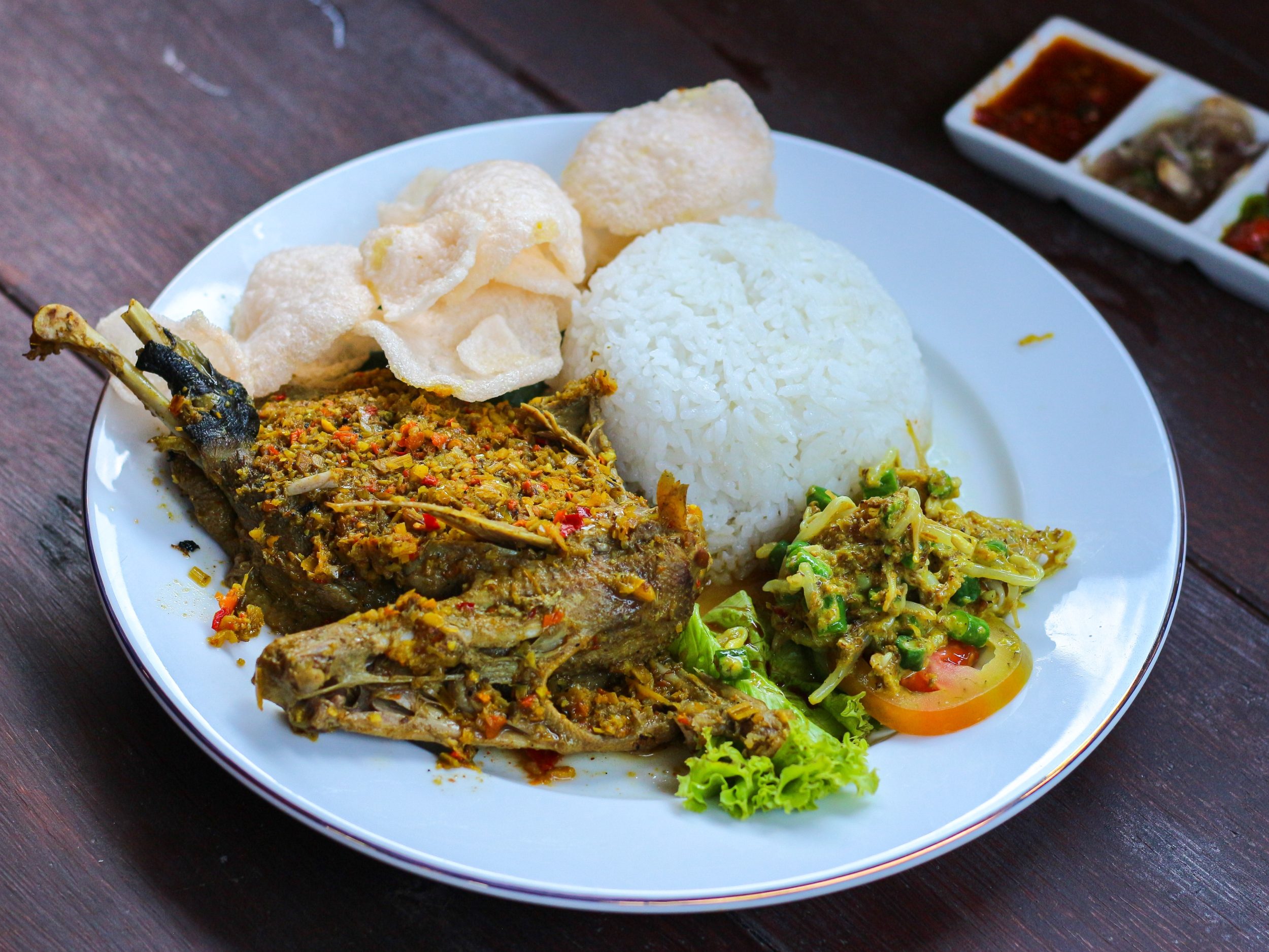 Bebek Betutu ist ein traditionelles balinesisches Gericht, das aus langsam geschmorter Ente besteht. Die Ente wird mit einer Mischung aus Gewürzen und Bananenblättern eingewickelt und stundenlang gegart, bis sie zart und aromatisch ist. Ein wahrer Gaumenschmaus!