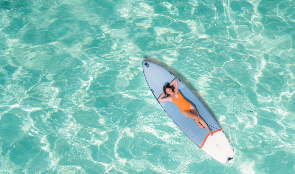 Frau liegt auf einem Surfbrett in Thailand